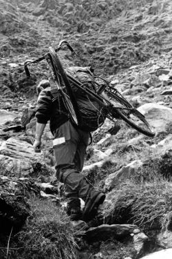 It transpires that Kellet made the journey with his two sons and met the couple along the way (later identifying himself in Schmidt’s photographs). Observing their struggle, he offered to help them by strapping the bike to his rucksack. Kellet’s rucksack and climbing boots were displayed in the exhibition on plinths, and exuded an indexical presence.