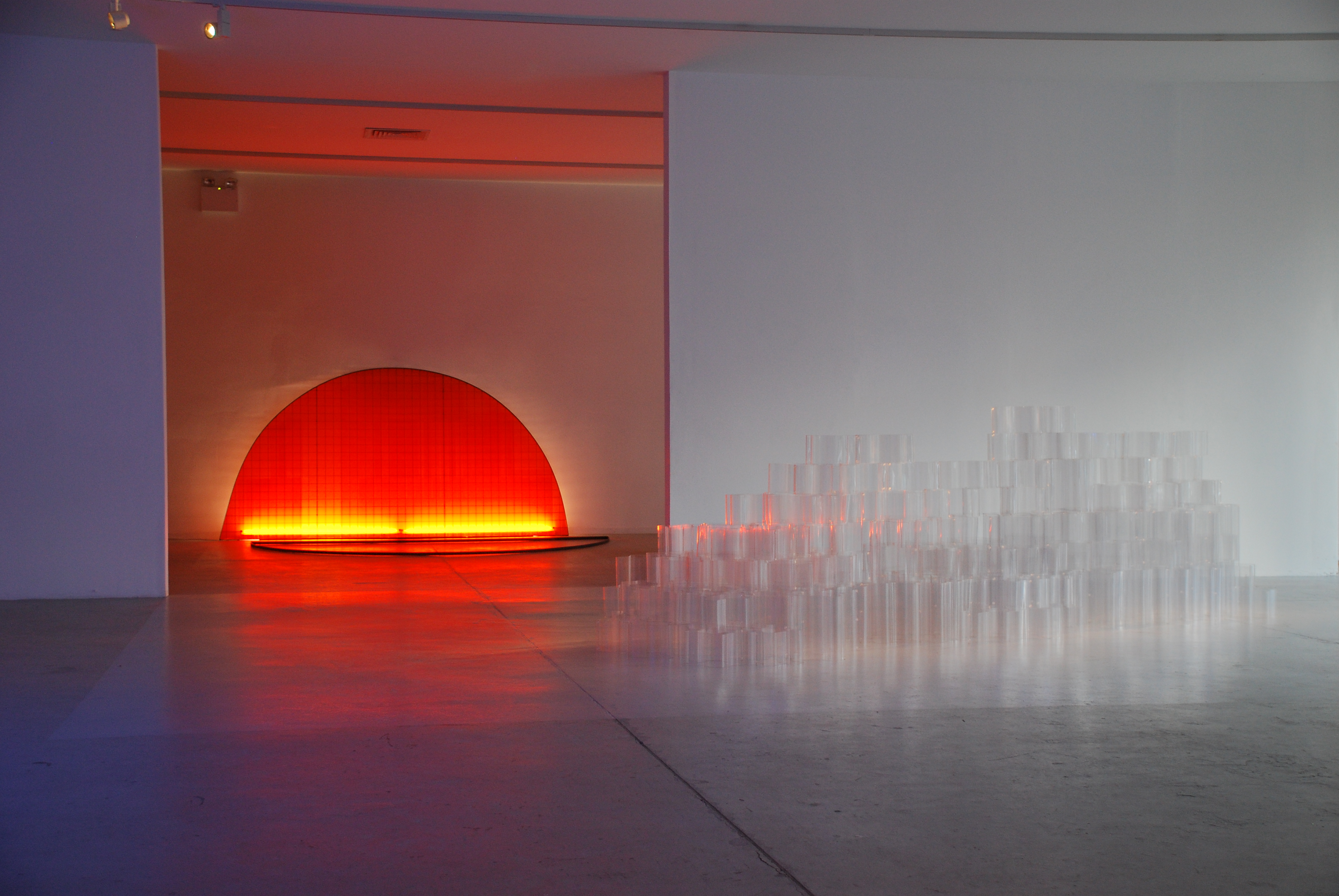 Of things yet to come was a static sunset, composed of industrial steel gridding and layers of amber perspex, illuminated from behind by fluorescent strip-lighting placed at floor level. It made me think of post-card images: sun-sets at iconic sites; The Pyramids, The Taj Mahal.. The re-production and circulation of such imagery serves to perpetuate a false reality. Fully aware of its artificial state, I marvelled at its beauty all the same, and basked for a moment in its radiance.