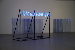 Mulholland’s use of neon signage stands out as being undeniably ‘of the moment’. Frieze Art Fair 2011 show-cased a large amount of text-based work, with extensive use of neon lettering employed by artists such as Cerith Wyn Evans, Dominique Gonzalez-Foerster and Tracey Emin. This contemporary re-appropriation of neon is not concerned with nostalgia, rather, it is a mode of declaration that subverts any commodity function, sign-posting instead the stark truths that persist beneath the surface. Are we there yet? articulates a universal impatience. It directs the viewer to a vision of ‘paradise’- once a simplistic image, functioning in the mind of the city-dweller as a site of liberation – but in late-capitalism, ‘paradise’ is exposed as a displaced, artificial landscape, more problematic than our immediate terrain.