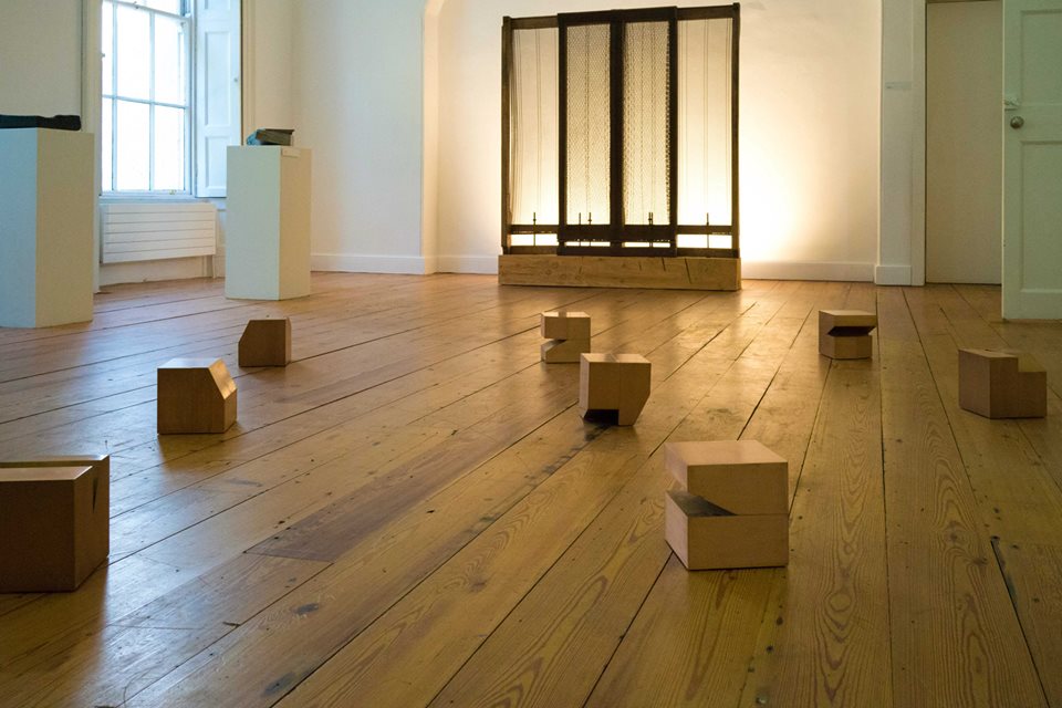 On entering the gallery, the viewer confronts a more complex configuration of materials – Eucalyptus, Yew, Oak and Bog Oak – in ‘Pica Pica’ or ‘Magpie’ (2011). Geometric abstraction gives way to organic, seemingly figurative forms, leaving the viewer to garner some narrative content or meaning from the piece. On reflection, art historical, literary and spiritual references pervade every artwork within this important and well considered exhibition:- Eastern philosophy permeates vertical wooden planks, hung in triptych formations, conjuring a lightness of Chinese paper scrolls flapping in the breeze; Solid slabs of timber, warped into shape, allude to fragility and impermanence, curling at the edges with the ease of a well-thumbed page; Small geometric bronze casts contrast with ashen wooden surfaces, their sharp lines shimmering in metallic repetition. And finally, ‘Sinnerman’ (2013) – an unyielding confessional structure, with steel mesh screen and low rear lighting – appears as a monument to ‘last utterances’, which neither threatens nor soothes, but bears witness (as a magpie might do) to some ominous or unmentionable act.