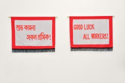 Examining the conditions of the present-day worker, Marianne Flotron’s multi-channel film WORK, 2011 depicts a therapeutic intervention in a Dutch corporate setting. Using techniques from the Theatre of Oppressed and guided by its director, participants search their souls, uncovering their true feelings about their living and working conditions. The resulting sections of footage are presented across four screens, installed in a room isolated from the main gallery space. Following a residency in Dhaka, Bangladesh, Aideen Doran is currently devising ways to synthesise her experience. Her photographic and text-based contributions to the exhibition’s publication focus on the poverty and inequalities of workers in the region’s garment factories, outlining the precarity of globalised labour. Doran’s new works have gathered momentum, combining digital stills, audio and dual-language textile banners which locate a more hopeful pop-optimism in the relentlessly industrious process.