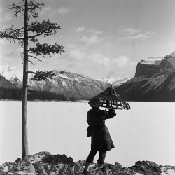Just as water scarcity governs the parched landscapes of gallery one, extreme contrast is achieved in galleries two and three, where western Canada’s frozen wilderness is represented as a vulnerable and contradictory site. A wall-mounted text – Bitumen by Canadian poet Karen Solie – plucks at the landscape’s ancient rhythms while mobilising modern-day cultural, geopolitical and industrial references to forge tangible links with far off places. Water Conversations – Alberta, 2015, examines the impact of ubiquitous fossil fuel extraction in the region, articulated through a range of interventions and documented in a series of large-scale, black-and white-photographs and a crisp new film work. Iconic ‘postcard’ scenes of lakes and snow-capped mountains are juxtaposed alongside vexed sites, including a cement factory at the edge of a forest and an Indian Trading Post selling native handcrafts, moccasins and furs ‘direct from the trappers’. During pensive, performative walks, the artist carried a weighty parasol sculpture, made from recycled rubber and aluminium. Implanted in a large rock, perched on a four-wheeled trolley, the parasol appears as a counter-monument in the gallery setting, perpetually fluctuating between transience and permanence. Other props and artefacts embodying the artists’ journeys are also displayed, including an ice-pick and a well-worn canoe. A pair of ‘found jigsaws’, featuring twee depictions of Canada’s West Coast, provide a point of reference for the artist’s personalised jigsaw edition. The featured image comes from the series OH Alberta: Bewildered in Banff, 2015, where a banner, embroidered with the word ‘bewildered’, is paraded near Banff’s Bow River Bridge. The actual banner, complete with rabbit fur embellishment, rests meditatively against the gallery wall. Within the confines of gallery three, the fur-lined hat, winter coat and snow boots worn by Macleod hang on the wall, alongside the handheld blowtorch which features in her film. This shadowy presence conjures associations with Joseph Beuys’ Felt Suit, not least in terms of the garments’ insulating properties, and tentative links between physical warmth and spiritual endeavour. Many of the ideas circulating in the exhibition are crystallised in a solitary ornamental ceramic plate – originally an item of merchandise from the Canadian oil well servicing company CenAlta Ltd. The plate’s regal golden trim and illustration of an oil well adjacent to a lush green pasture dulcify neither the dubious legacy of hydraulic fracturing technology in the Alberta region nor the industry’s links with water contamination and increased occurrences of minor earthquakes. With this artwork, the viewer is returned to the Leitrim context – where ‘fracking’ and the privatisation of water services remain contentious national concerns – to reflect on the tools mobilised by artists when contributing to urgent global conversations.