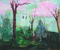 JL: For me, your landscape paintings often feature startling, unnatural or even supernatural elements: an ominous glow, an implied explosion or stray components such as a synthetically-coloured tree. Is there a sense that you are trying to subvert or break away from the tranquillity (and historical baggage) of the pastoral scene?