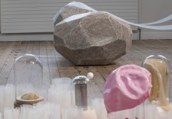 Maud Cotter’s solo exhibition at The Dock, ‘a consequence of – a breather of air’, exemplifies the artist’s intimate, almost metaphysical relationship with her materials. In Gallery One, a large tubular structure, matter of fact, 2016, has a diagrammatic quality, suggesting an exercise in drawing in space. Its preoccupations, however, are deeply engrained in the politics of everyday life, including an analysis of the properties of imported steel (necessitated by the collapse of the steel industry). Cotter is responsive to micro details and points of tension, as well as the intangible qualities of ‘matter’ – such as the memory of molecules, or the harnessing of energy and air. Throughout the exhibition, artwork titles are reiterated in cursive writing on gallery walls, like murmurs of overheard conversations. A series of sculptures, mounted high on the mezzanine wall, are spot lit to dramatic effect. These ethereal, flotsam-like forms echo the buoyant and bioluminescent properties of marine life – a nautical inquiry reinforced through Cotter’s use of netting and limpet-style relief elements. In Gallery Three, a group of slightly forlorn objects rests on a bed-like shelf. Several variations of used hot water bottles have been chopped, split and cast – a process the artist likens to ‘gutting fish and retaining the heads’. In different states of warping and degradation, these rubbery amputees unfurl and fold in on themselves. Having once radiated with heat, they disclose memories of the human body that have since been displaced. Playing with the high-reaching proportions of Gallery Two are two sculptural arrangements achieved through the inscription of vertical lines in space. In a breather of air, 2019, polythene sheeting is dropped from above and draped over two rock-like structures. Nearby is a grouping of ten ‘bubbles’, comprising differently sized glass domes, whose contents are in a perpetual state of spilling beyond their inscribed boundaries. The repeated use of glass allows a sense of fusion among the detritus, based on how readily it absorbs other material boundaries. As a museological device, glass vitrines have long been associated with the display of cherished objects. Cotter’s ‘bubbles’ also call to mind self-sustaining botanical terrariums, offering a useful metaphor for the organisation of human thought into autonomous disciplinary fields. The ultimate synthesis of the assembled objects into one cosmological body suggests, however, that we only ever achieve small pockets of order – that beyond these regulated chambers exists a rogue and chaotic exterior realm.