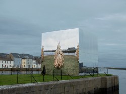 A large, futuristic cube structure was recently installed on Galway’s Claddagh Quay – the site of one of Ireland’s earliest fishing villages, later associated with eighteenth-century industrialists, who harnessed the River Corrib (still thundering through the city) to power dozens of flour mills. However, rather than an incongruous presence, the shimmering, seven-metre-tall, temporary pavilion feels strangely of this place. Designed by Irish artist John Gerrard to host his two new artworks – commissioned by Galway International Arts Festival for Galway 2020 European Capital of Culture and presented consecutively in dual locations – three sides and the roof are clad in polished metal, seductively reflecting the surrounding landscape, while the front comprises a luminous, high-resolution LED screen. (A second work, Mirror Pavilion, Leaf Work (2020),will be shown in October in a peat bog in Connemara, where the pavilion structure will be re-sited.) Gerrard uses real-time computer graphics (developed by the commercial gaming industry) for poetic ends, in this instance employing 3D scanning technology to create a ‘virtual portrait’ of Claddagh’s middle pier, upon which the structure is situated.