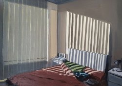 The prolonged closure of studio spaces during lockdown meant that many artists had to dramatically alter their processes to suit the confines of working from home. Indeed, a defining feature of the pandemic was the merging of professional and domestic lives, as the interiors of people’s homes were revealed to us in unprecedented ways. The exhibited artworks closely examine the familiar textures of the domestic realm, as if magnifying seemingly banal microdetails, like architraves and other architectural fixtures, that go unnoticed in ordinary life. Across the assembled works, we observe the quality of light, as it spills through blinds at dusk or sunrise, casting shadows across empty rooms. Also documented are textures of the natural world – from plant life, moss and foliage, to encroaching weeds and blossoms. The ubiquitous appearance of flowers – whether fresh, wilting, or fake – seems to act as Memento Mori, marking the tragic proximity of death throughout this period. There are further simulations of nature through the use of Astroturf as a sculptural material, while other artworks trace a slow and durational exposure to the elements.