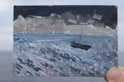 Artworks selected for Browne’s exhibition at RCC are configured in site-specific clusters, presenting multiple depictions of the local landscape at different times of the year. This methodology hinges on the artist’s daily ritual of painting outdoors, often working at speed on small boards to capture fleeting moments in all weather conditions. Like logbook entries, the resulting artworks chart a fluctuating landscape that has been cast into the current of time. A boat hurtles through a blizzard at dusk, encircled by a vortex of golden snowflakes. There are atmospheric studies of the midsummer moon, and turbulent seas at daybreak. On occasion, the vertical drag of a brush causes wet paint to bleed convincingly into the sea, as an impending downpour might engulf the dark horizon.
