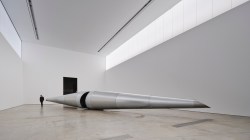 However, where the 2017 sculpture echoes the anatomy of marine life, boats, submarines or torpedoes, this new commission in Carlow feels more precisely of the sky. It is an aerodynamic yet flightless form, a grounded aircraft of unknown origin. Fabricated in steel and Perspex with a heavily riveted surface, it resembles a warplane, harpoon missile or sniper scope, and is bleakly understood against the prevailing backdrop of escalating militarisation across the western world. While Ireland does not have a history of arms manufacturing, the country’s longstanding neutrality is unequivocally compromised in allowing US military stopovers in Shannon Airport – an occurrence met with unceasing protests since the Iraq War that have intensified amid the horrors unfolding in Gaza. The only other artwork in the Main Gallery is the shadowy, black, wall-based sculpture In the Roundness of Being, 1996, from which the exhibition takes its title. Like a dark, distant silhouette, this comparatively tiny form returns us once again to the proportions of the body and, in this dramatic adjustment of scale, we are hauntingly reminded of our own fragile corporeality in the face of tectonic geopolitical pressures.